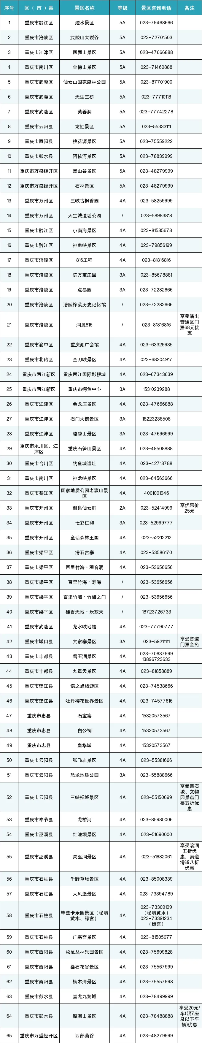 具体来看,一直到2月28日前,市民、游客凭重庆、成都、德阳、眉山、资阳五地参与活动的景区门票核销使用过的门票在7天内到另四地参与活动的景区购买门票时,即可享受首道门票(成人全票金额)五折优惠(仅限本人使用)。参加本次活动的重庆、成都、德阳、眉山、资阳五地景区共计84家,其中不乏金佛山、天生三桥、芙蓉洞这样的世界自然遗产,同时也包含了成都的天台山、川西竹海等知名景区。