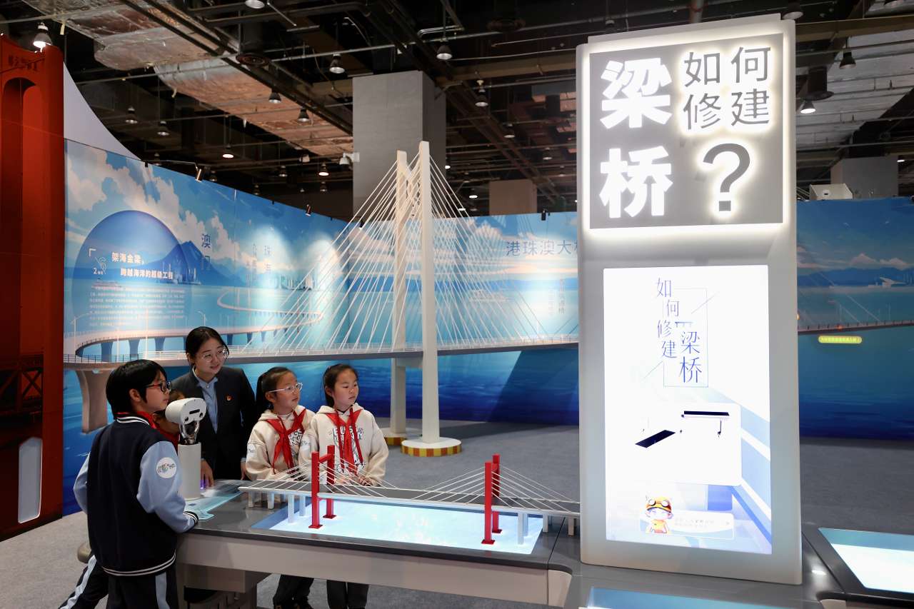 展览面积1000㎡,展出互动展品38件(套),借展珍贵实物12件(套),注重为观众打造沉浸式、多维度的观展体验。在这里,观众可以亲手搭建桥梁模型,借助MR眼镜、镜面屏等配套设备,直观了解桥梁基础知识;可以通过架桥机模拟体验,或操作造塔机模型、起重船模型,解码大国重器的奥秘;还可以模拟操作桥梁缆索检测机器人,近距离感受人工智能在桥梁建设与养护中的革新力量;此外,“自己拉自己”等趣味互动装置,将枯燥的科学原理融入轻松游戏,让观众在互动中领悟桥梁建造设备背后的科学内涵;钱塘江大桥、南京长江大桥、港珠澳大桥等标志性桥梁微缩景观打卡点,不仅可供拍照留念,更生动展现了中国桥梁技术的演进与深厚底蕴,彰显中国科技自立自强的决心与勇气。